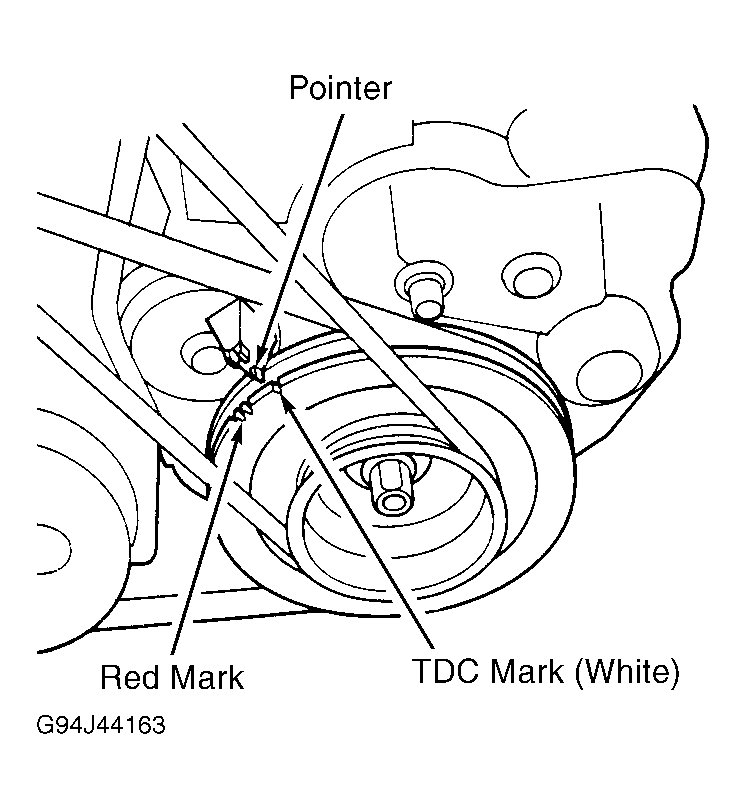 - Connect timing light to spark plug wire No. 1. Check base ignition timing. Red mark indicates 15 degrees BTDC. White mark indicates TDC. See Fig 2 . See IGNITION TIMING .