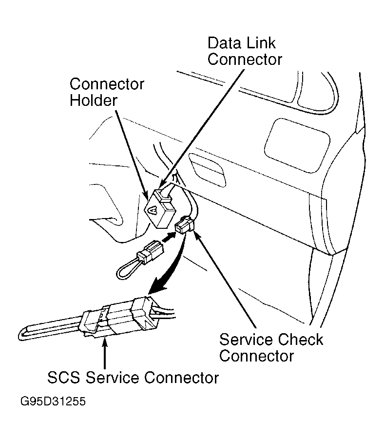 - Connect SCS Service Connector (07PAZ-0010100 ) to 2-pin service check connector, located under dash, right of center console. See Fig 1 . Service check connector uses a Green/Blue wire and a Red wire.