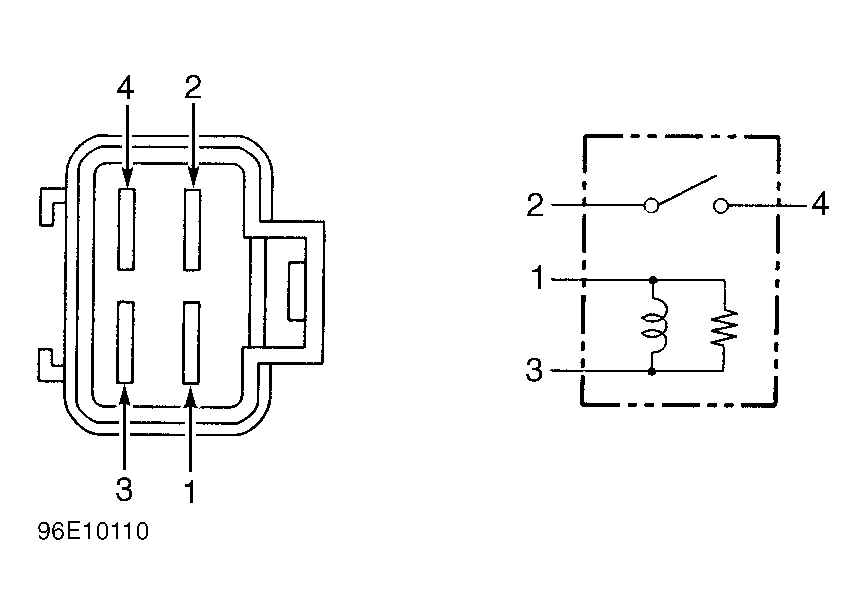 This 4-terminal relay is used for A/C, Fuel Pump and PCM power control. Test for continuity between terminal No.2 and No. 4, continuity should not exist. See Fig 1 . Apply battery voltage to terminal No. 1 and ground terminal No. 3. Continuity should exist between terminals No. 2 and No. 4. If not as specified, replace relay.