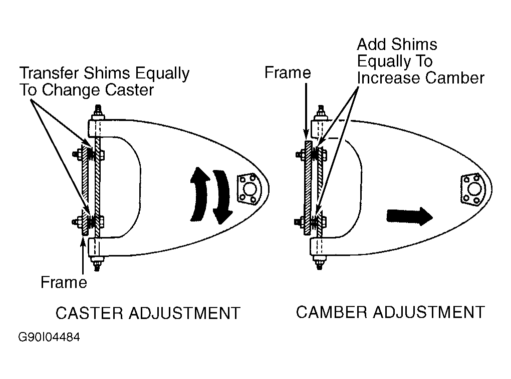 Adjust caster by inserting or removing shims between upper control arm pivot shaft and frame. See Figure.