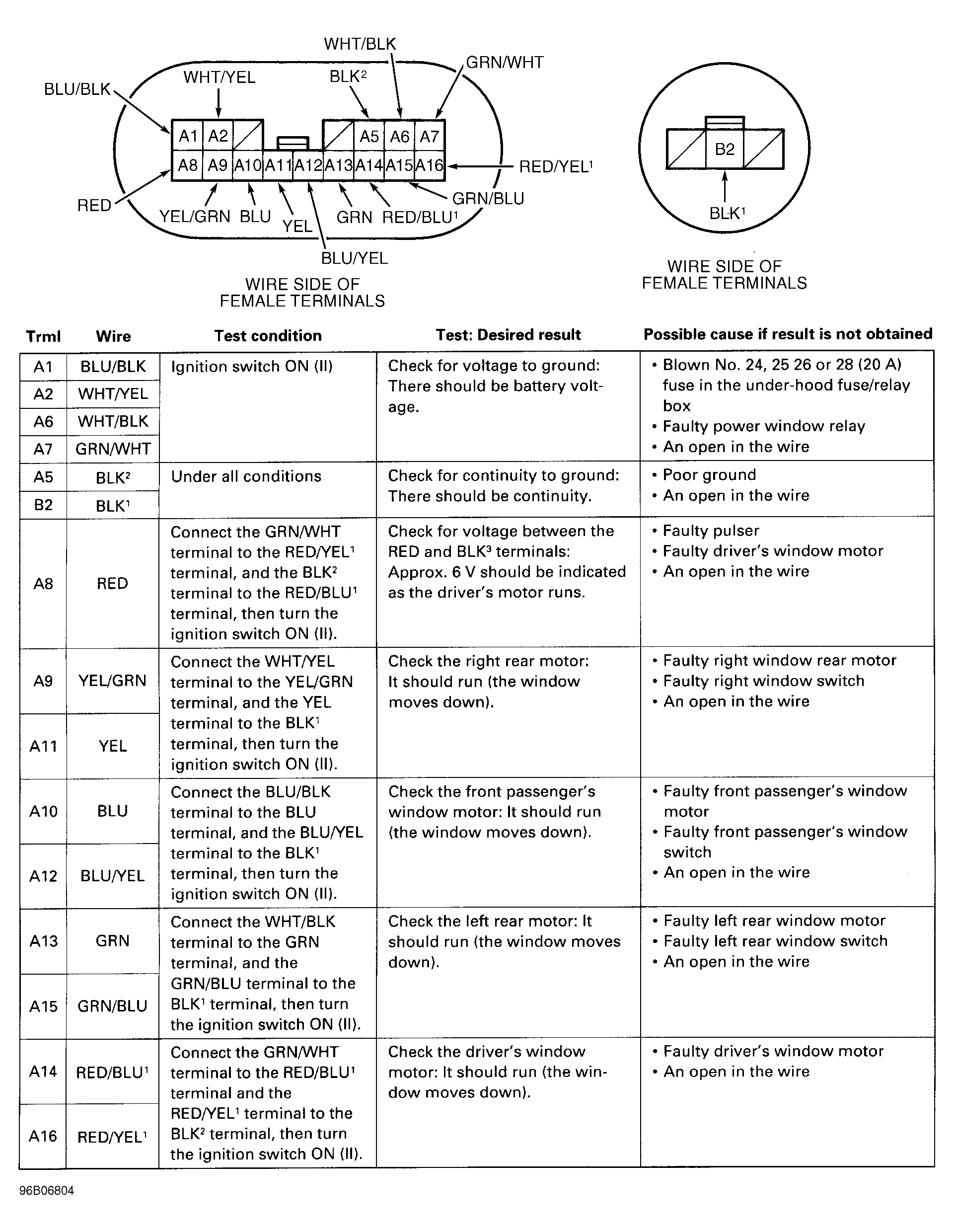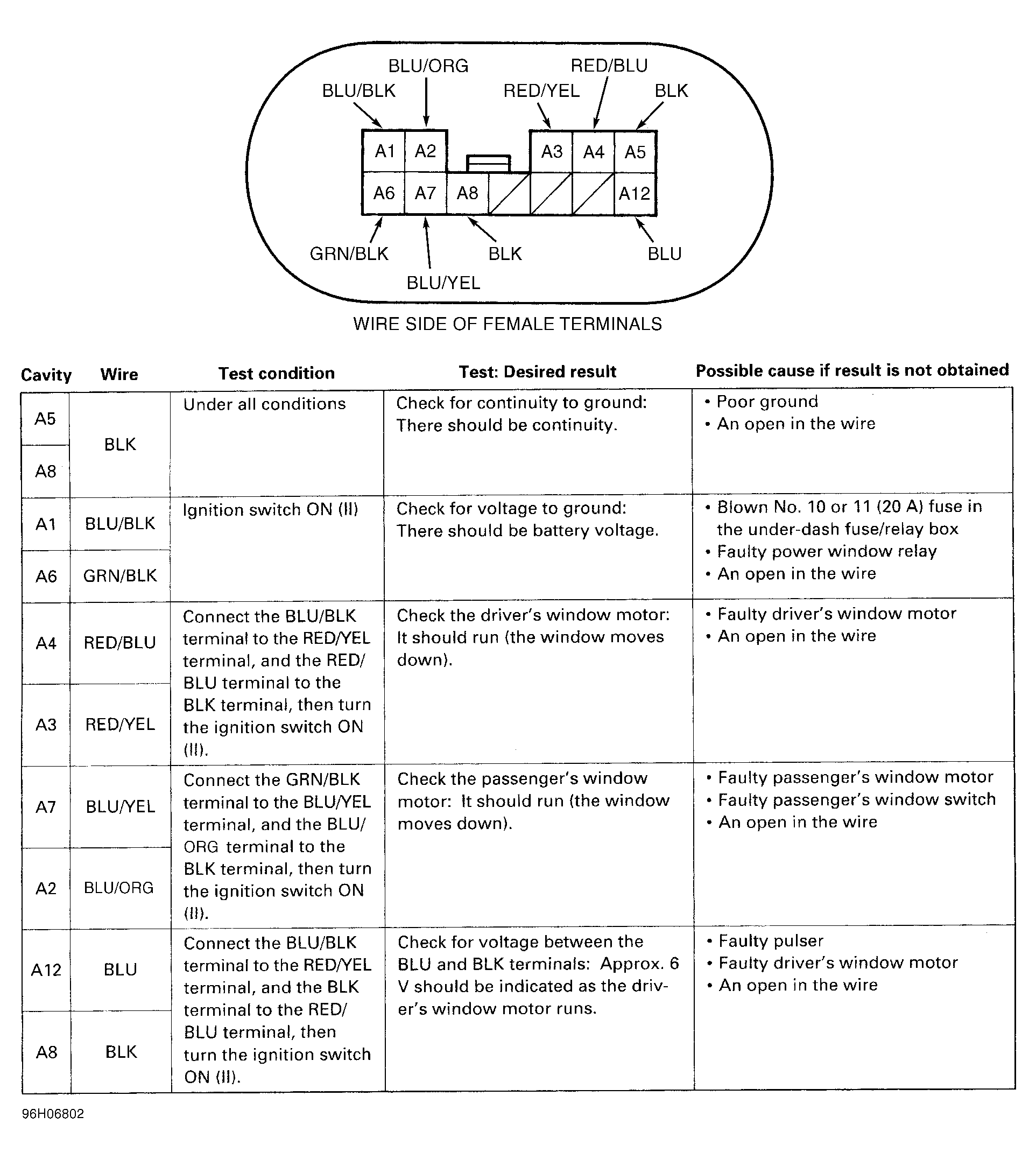 Turn ignition off. Remove driver's door panel. Unplug connectors from master switch. Using a DVOM, perform appropriate switch input tests. See. Fig 1 -Fig 4 . If all input test results are okay, inspect connector and terminals for damage and proper fit. If connector is okay and power windows still malfunction, replace master switch.