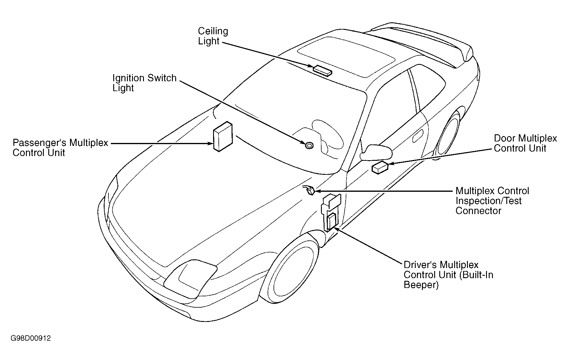 Multiplex control system consists of a door, driver and passenger multiplex control units. These 3 control units integrate independent control units using multiplex communication lines and has a built-in self-diagnosis function. See Figure .