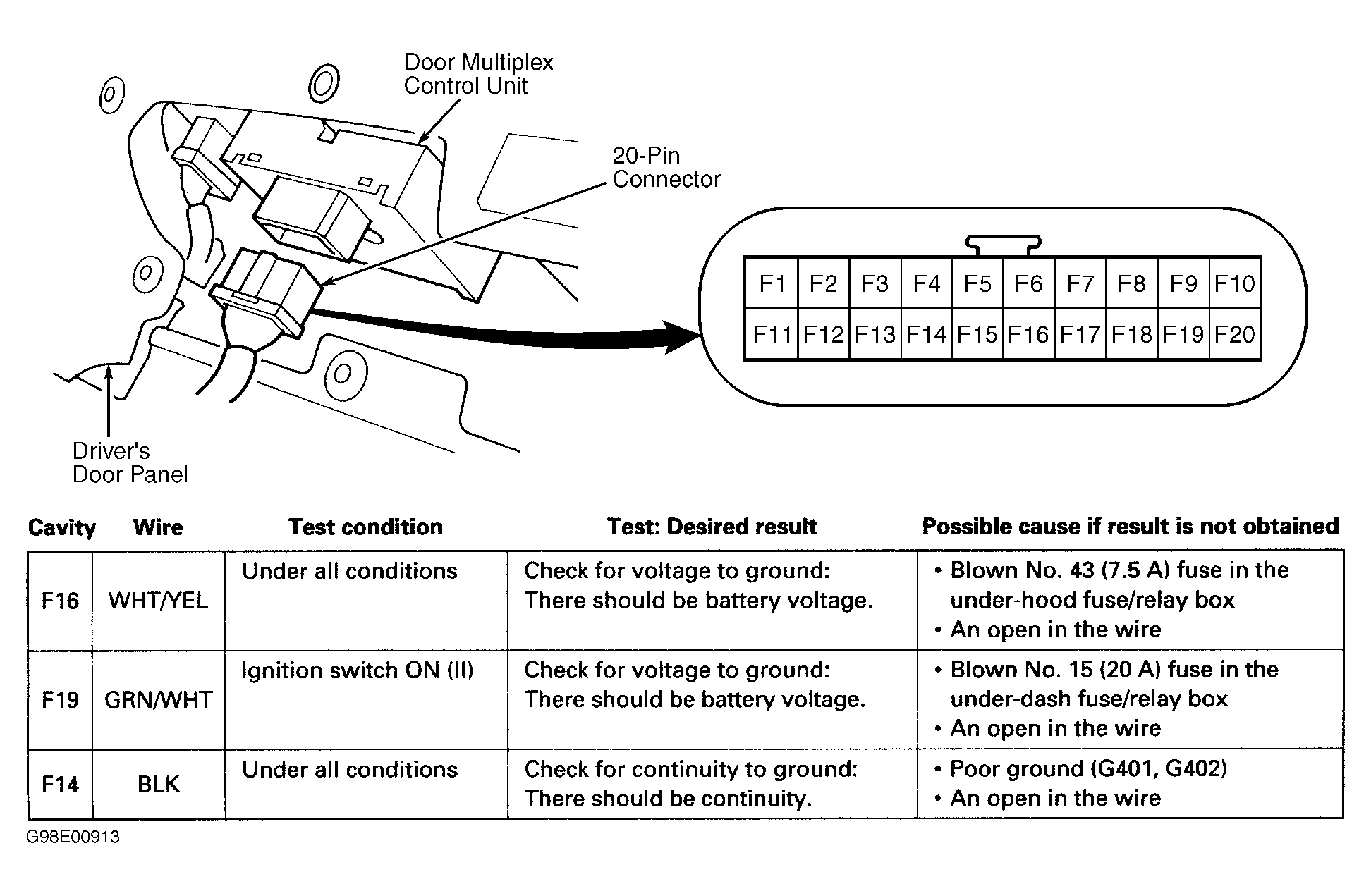 Remove driver's door trim panel enough to gain access to door multiplex control unit connector. Turn ignition off. Disconnect door multiplex control unit 20-pin harness connector. See Fig 1 . Check connector terminals and contacts. Repair as necessary and retest system. If connector terminals and contacts are okay, perform input tests. See Fig 1 . If test results are as specified, replace power window master switch. See REMOVAL & INSTALLATION .