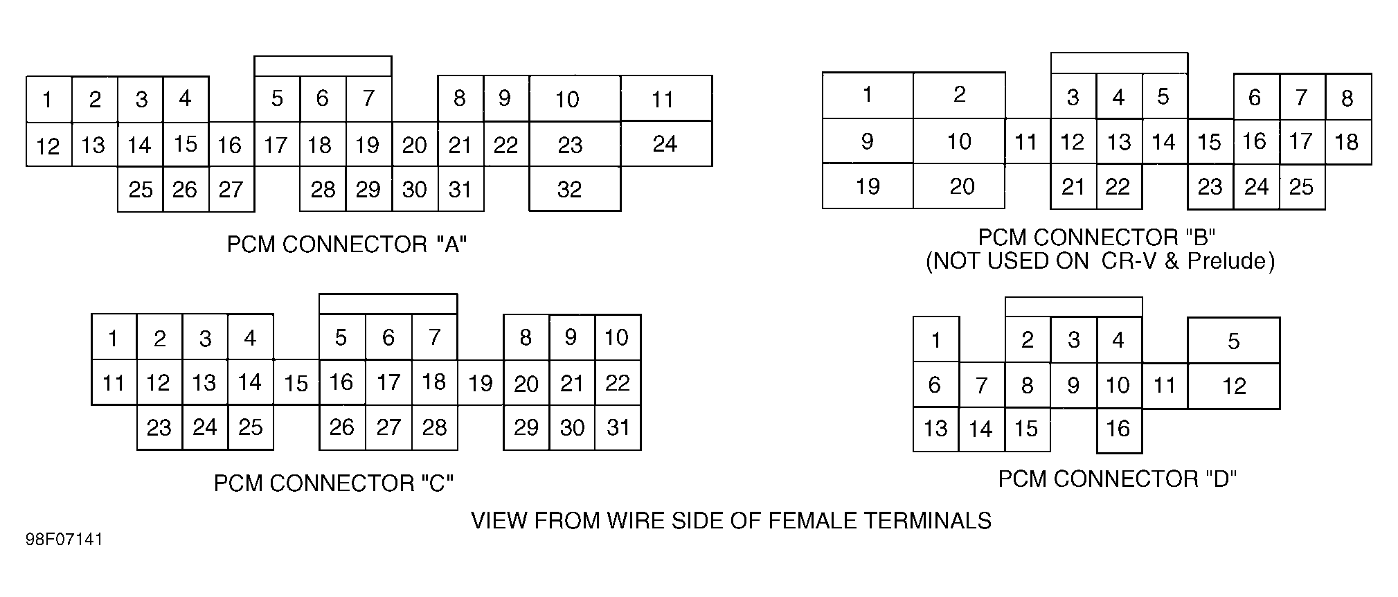 1. Measure resistance to ground at appropriate PCM ground terminals. See POWER & GROUND CIRCUIT TERMINAL IDENTIFICATION  . See Figure . Resistance should be zero ohms for each circuit. If resistance is not zero ohms, repair open to ground.