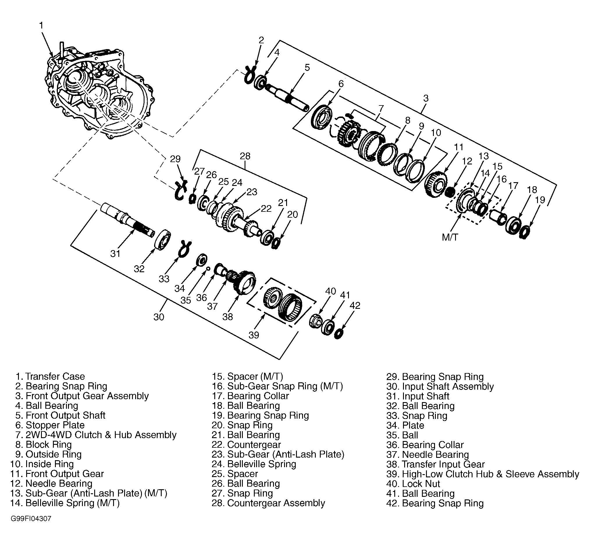 Transfer case components differ slightly between A/T and M/T applications. Refer to illustration for component identification during overhaul. See