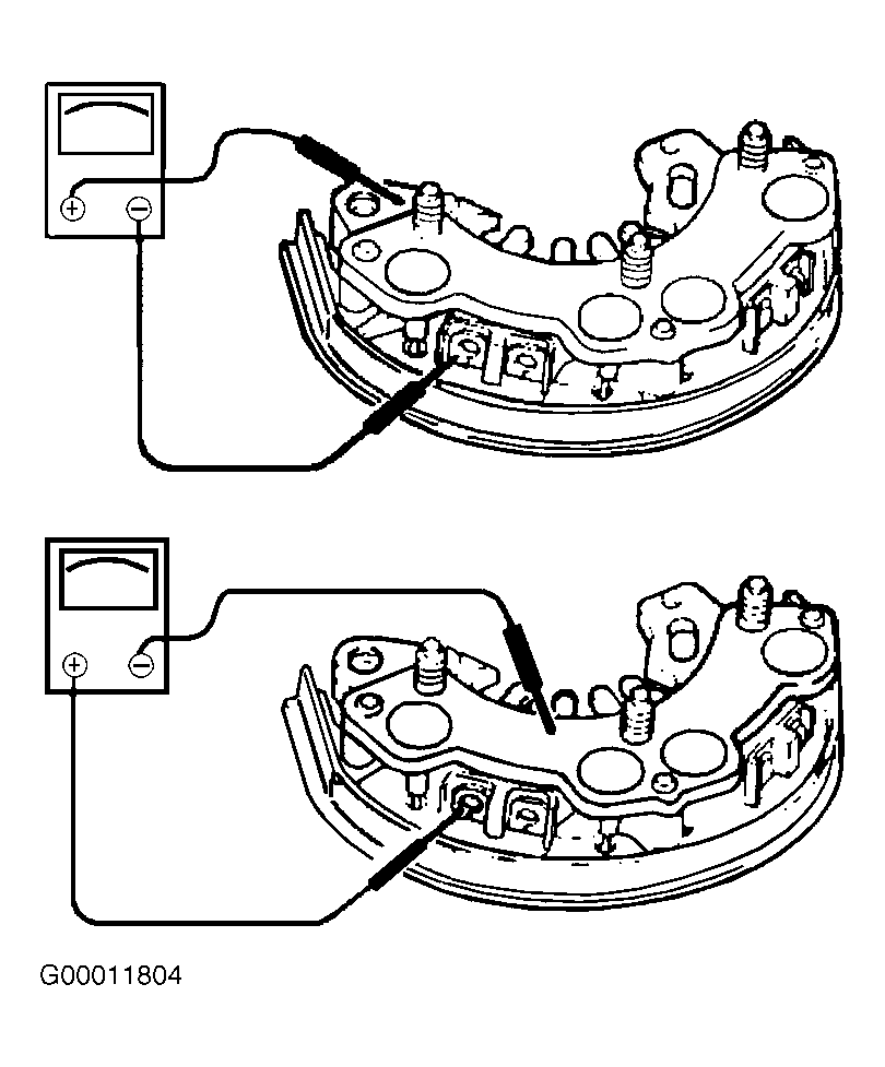 Measure the resistance between each diode terminal and aluminum diode fin in forward and reverse directions with the connection of the tester leads switched. See Fig 1 . The diodes are normal if resistance is nearly zero ohms in one direction and is infinitely high in the other direction. If a diode has no resistance or equal resistance in both directions, it is defective and should be replaced together with the holder