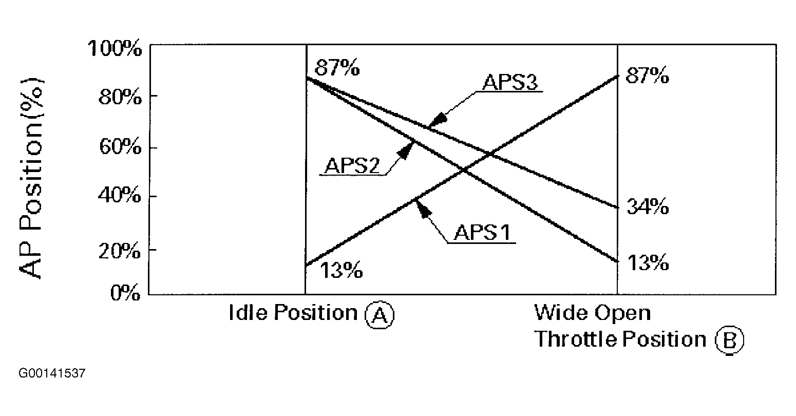 Accelerator Position Sensor (APS) located on accelerator pedal provides a voltage signal relative to accelerator pedal angle to PCM. APS signal is used by PCM to determine throttle valve adjustment position. APS signal is processed by PCM, PCM then commands throttle valve motor to move throttle valve. If scan tool indicates an APS failure, or an APS DTC is stored in memory, use following procedure to adjust APS: