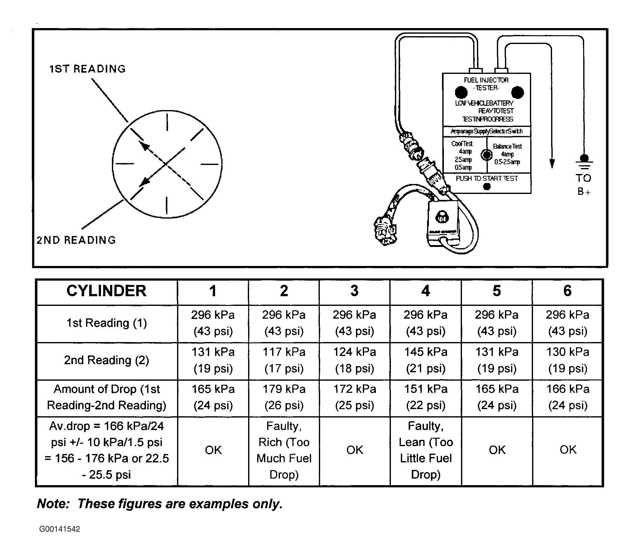 7. Repeat previous step for remaining fuel injectors. Subtract second pressure reading from first reading for each injector. The difference in readings is pressure drop value. Record pressure drop value for each fuel injector.