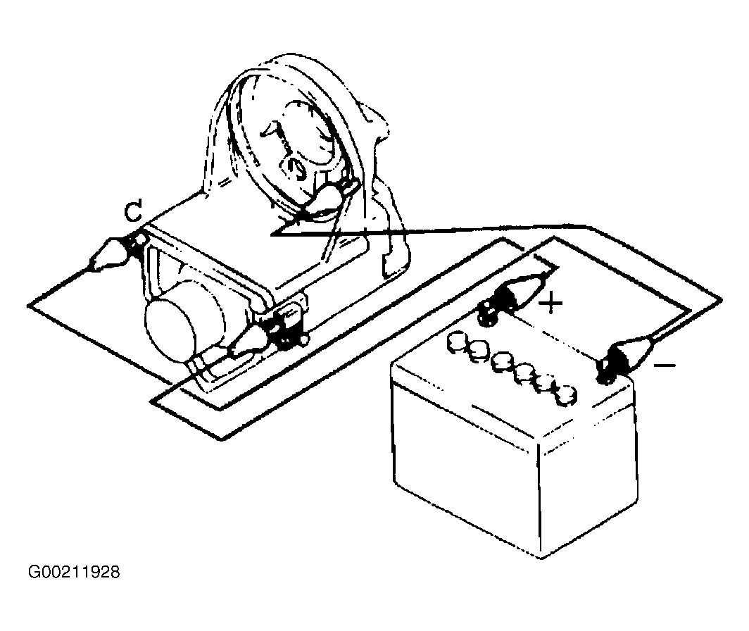 2. Verify that the pinion pulls out when the batter (+) pole is connected to terminal "C" and the pinion pulls away when the lead wire is disconnected from terminal "50".