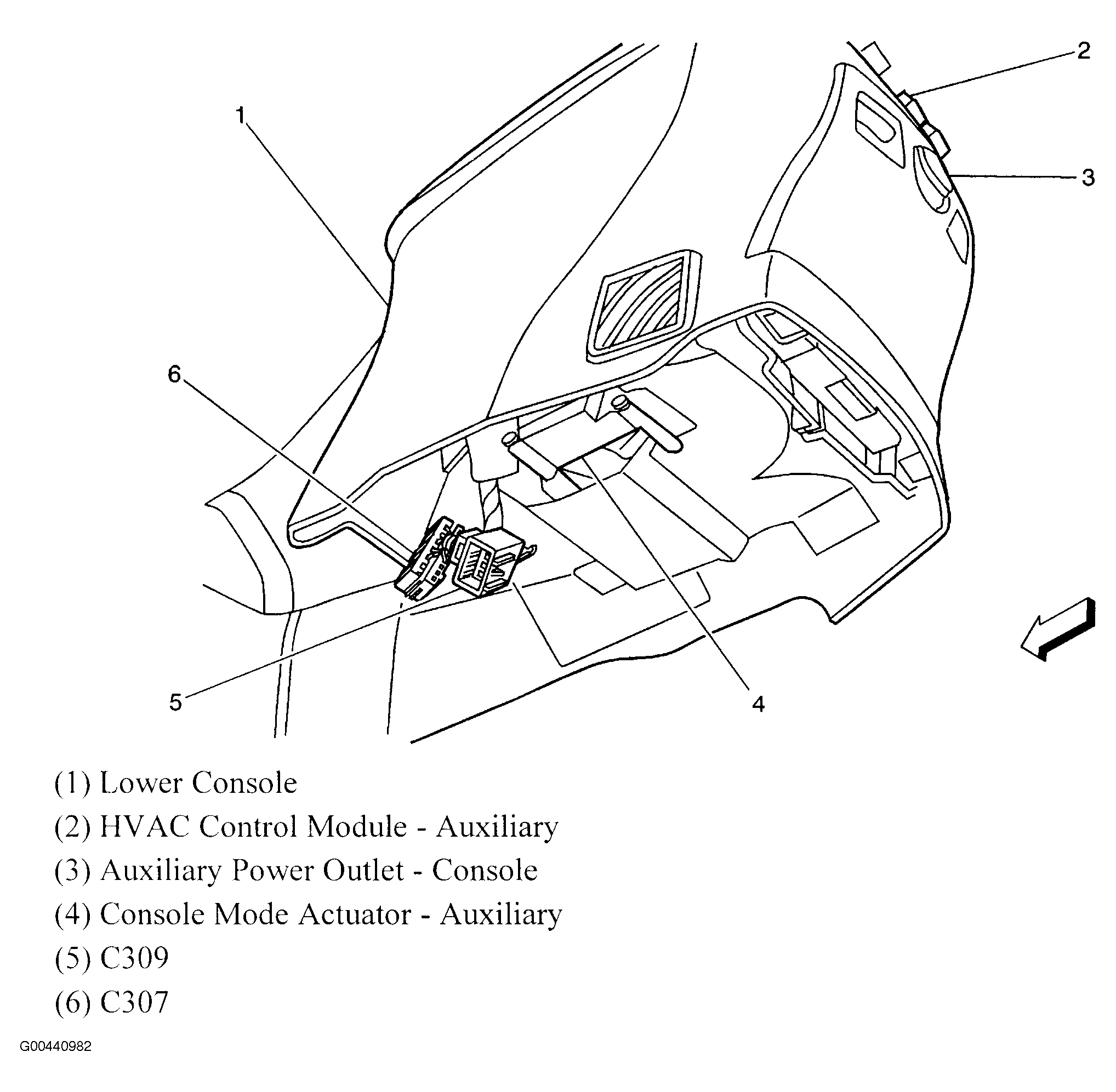 | HVAC Control Module-Auxiliary | Under lower console. See Figure. |