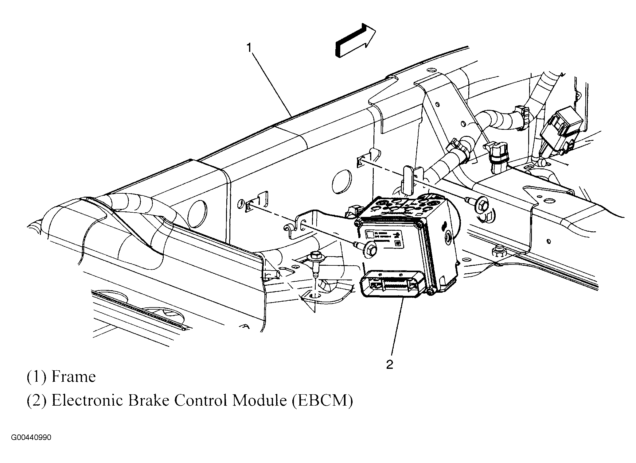 | Electronic Brake Control Module (EBCM) | On inner left frame rail, beside transmission. See Figure. |