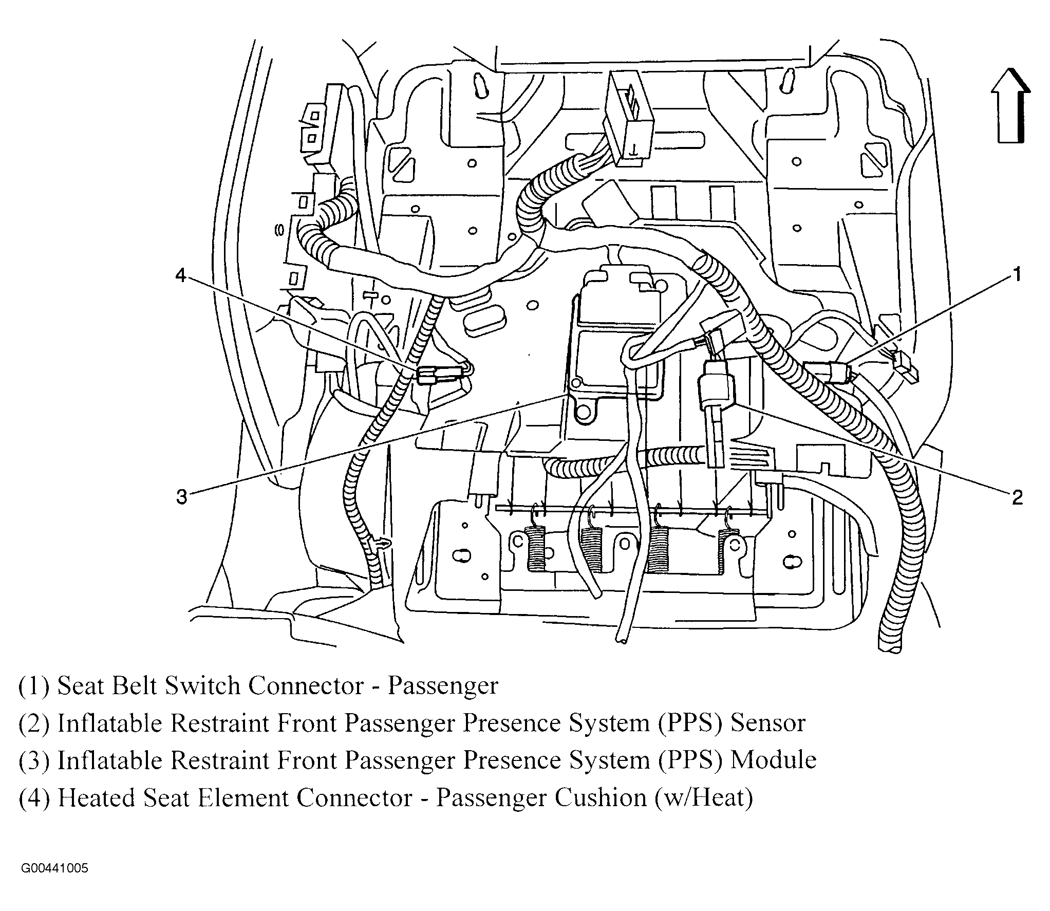 | Inflatable Restraint Front Passenger Presence System (PPS) Module | Under passenger seat. See Figure. |
