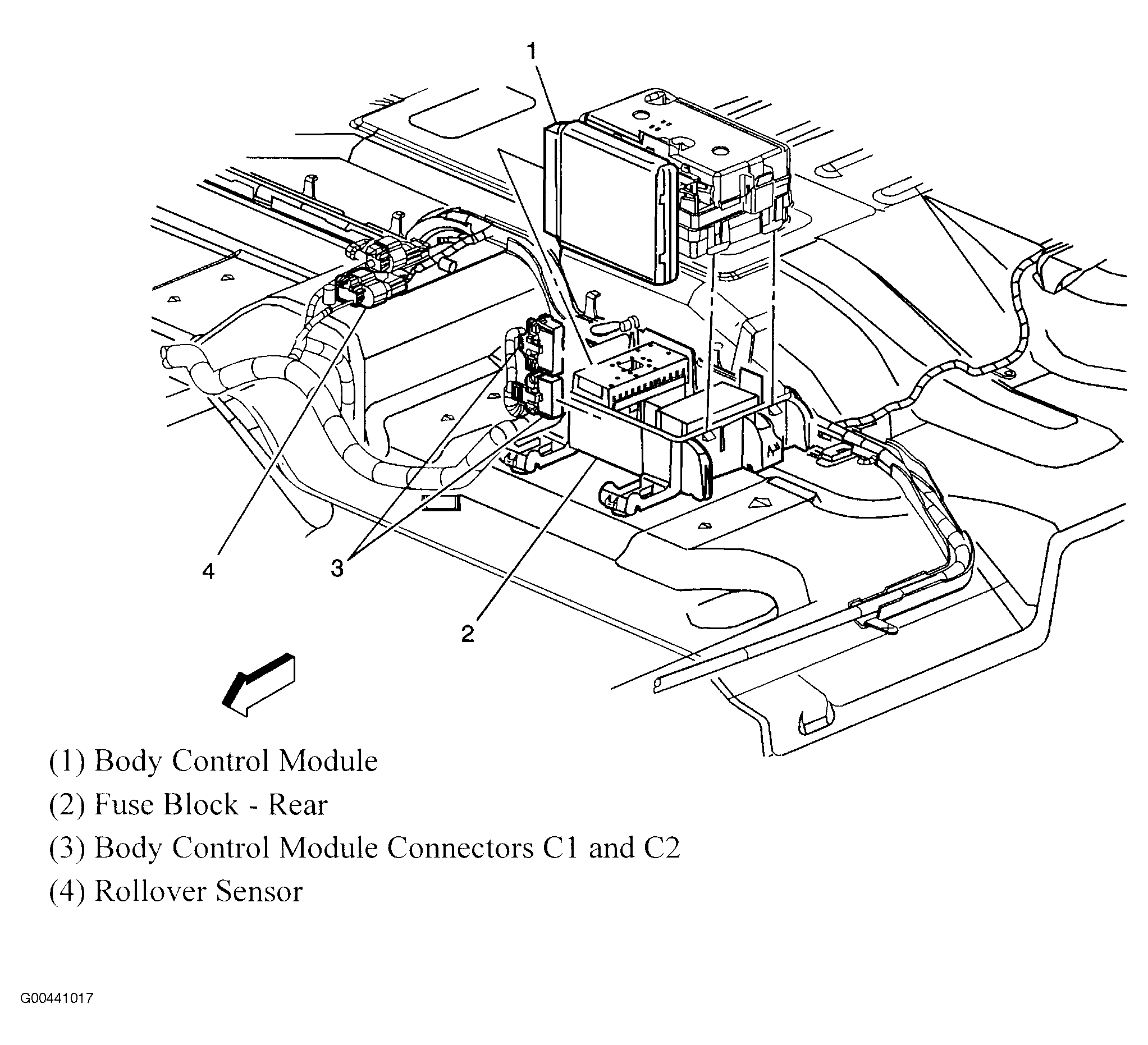| Body Control Module (BCM) | Beneath left rear seat, on rear fuse block. See Figure. |
