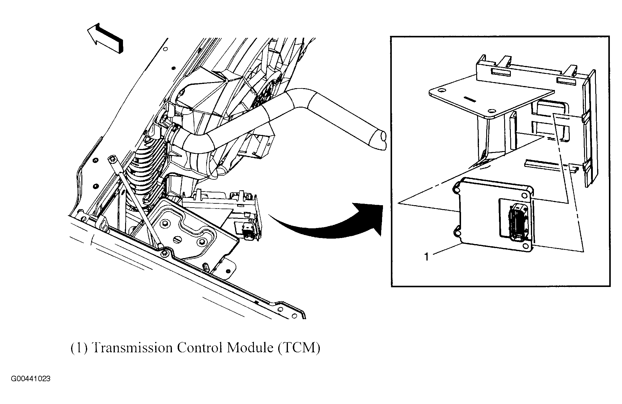 | Transmission Control Module (TCM) | Left front of engine. See Figure. |