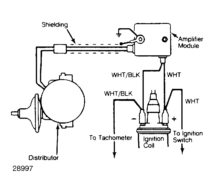 The pick-up coil includes a winding, pole piece and a permanent magnet. A 2-wire shielded harness connects it directly to the amplifier module. The amplifier module, housed in an aluminum case, is located near the distributor. It has a 2-wire harness, which connects to the coil primary terminals.