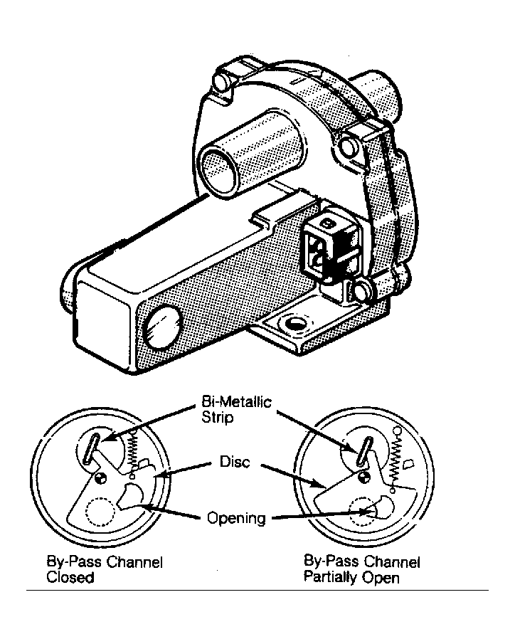 The heater coil on the bi-metallic strip is energized by the fuel pump relay. Control of the valve is based upon engine temperature. The air by-pass channel is open when engine is cold and gradually closes as temperature rises. At predetermined temperatures, air by-pass channel is blocked and additional airflow stops. See Fig 1 .