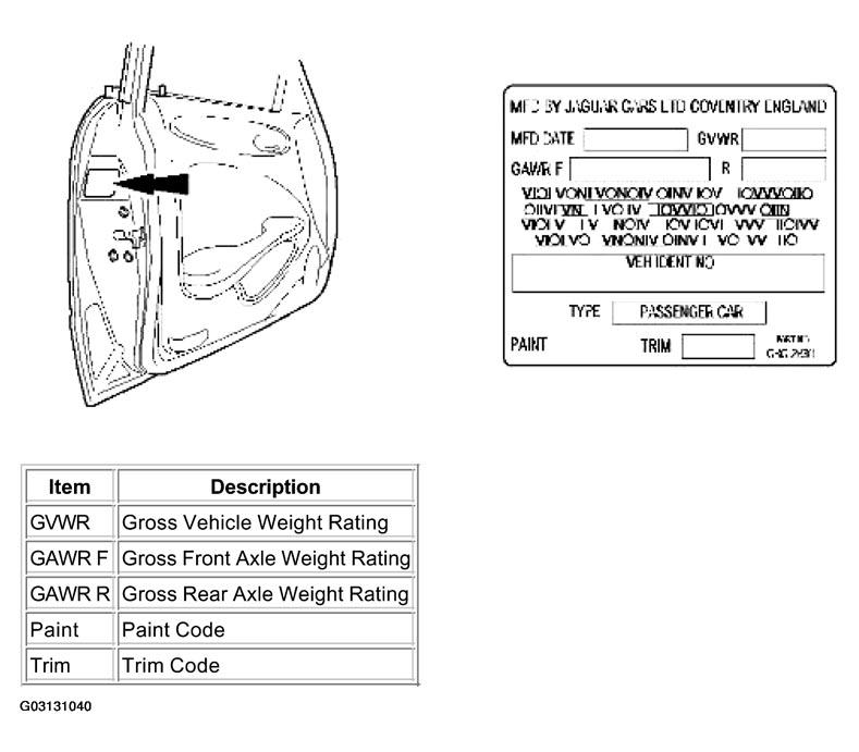 Dependent upon market, the VIN and other information is displayed on a label located either on the rear edge of the LH front door or on the body front upper crossmember. See Fig 1 and Fig 2 . For certain markets, the VIN appears on a bar code label referred to as the Certification Label and additionally carries the month and year of manufacture, vehicle weight data and paint and trim codes. The VIN is also displayed on a plate visible through the windshield. It is essential that the vehicle identification number (VIN) is quoted when ordering parts, and in all associated correspondence.