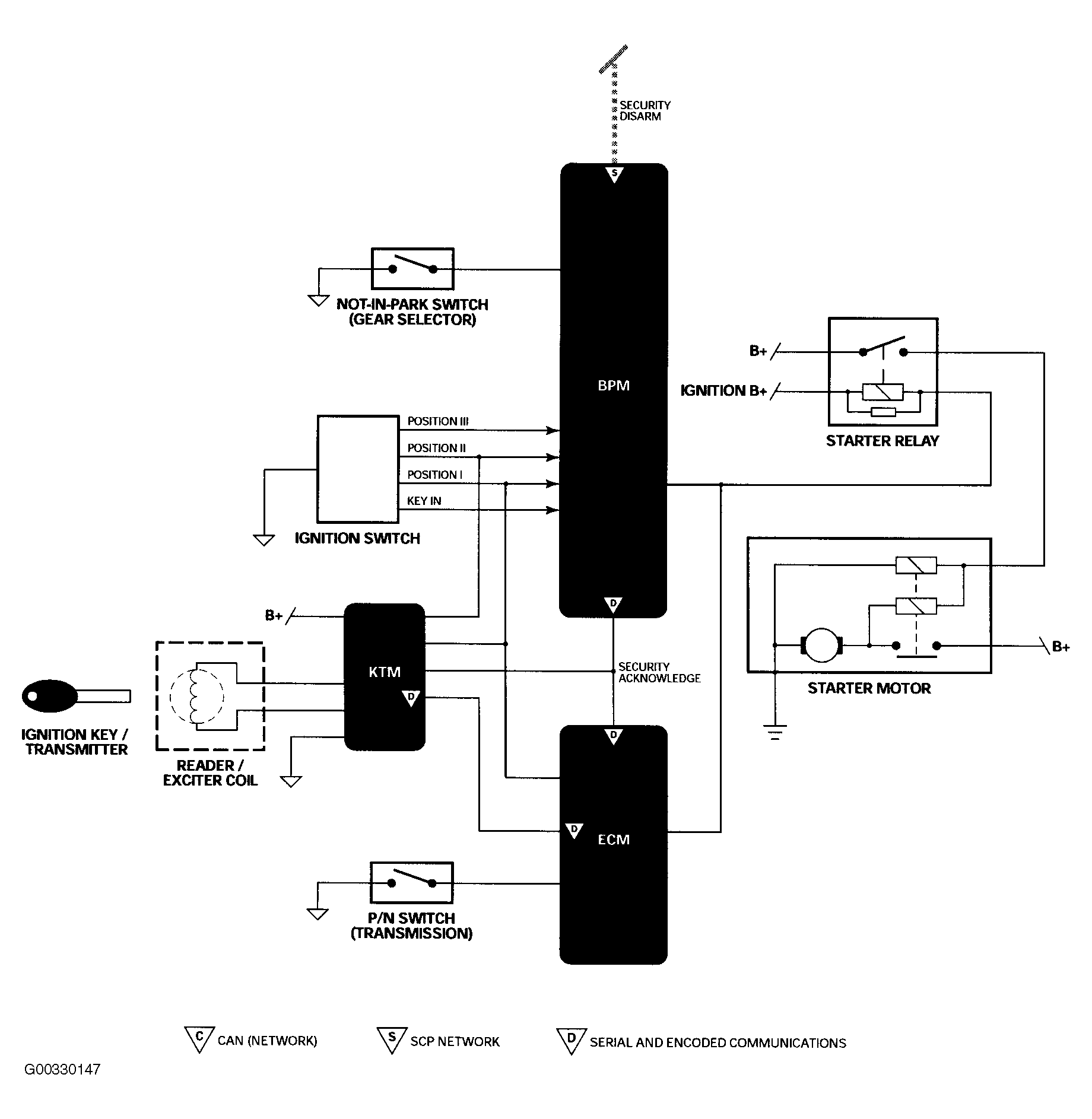 If code matches the KTM code, the KTM outputs an okay to start signal to ECM. The ECM enables fuel and ignition. The ECM outputs security signal to BCM. The BCM receives park signal from not-in-park switch at gear selector and enables cranking if security system has been disarmed. With ignition switch in START position (III), crank signal is received by BCM. The BCM grounds starter relay coil to energize starter. The ECM receives starter relay coil signal and sets engine starting values.