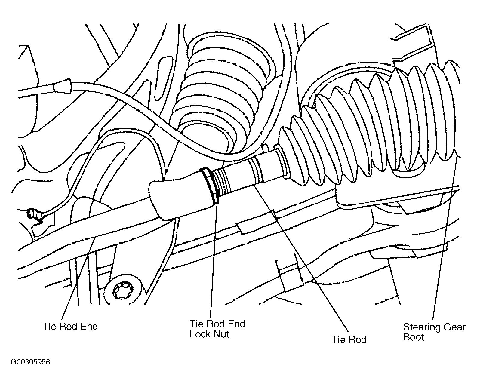 Do not allow the steering gear boot to twist when adjusting the tie rods. Allowing steering gear boot to twist may result in damage to the vehicle.