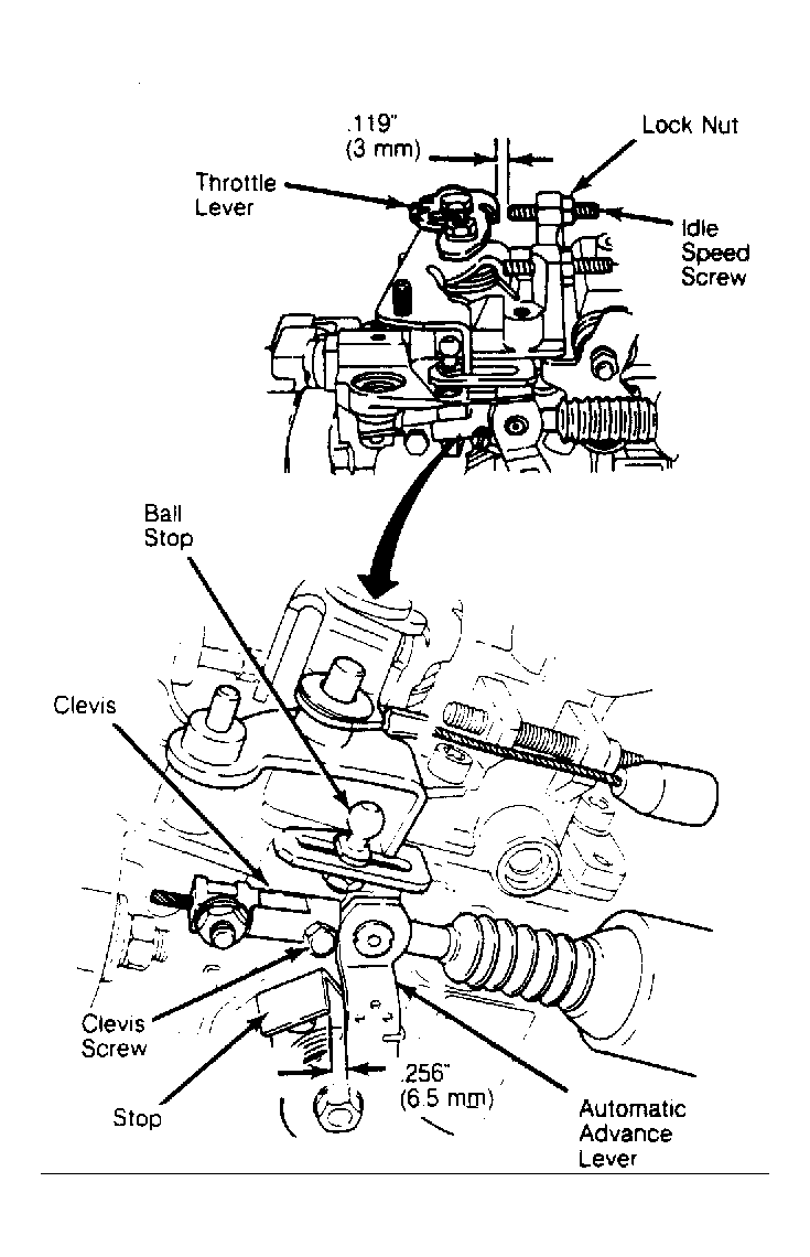 - With .256" (6.50 mm) shim between automatic advance lever and stop, loosen ball stop. See Fig 2. Move ball stop forward or rearward to obtain a .119" (3.00 mm) clearance between throttle lever and idle speed screw. Tighten ball stop, and go to next step.