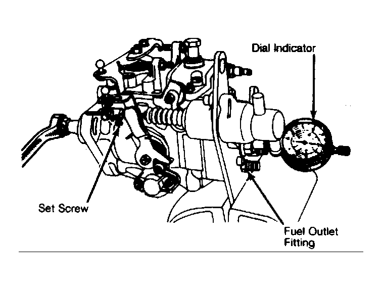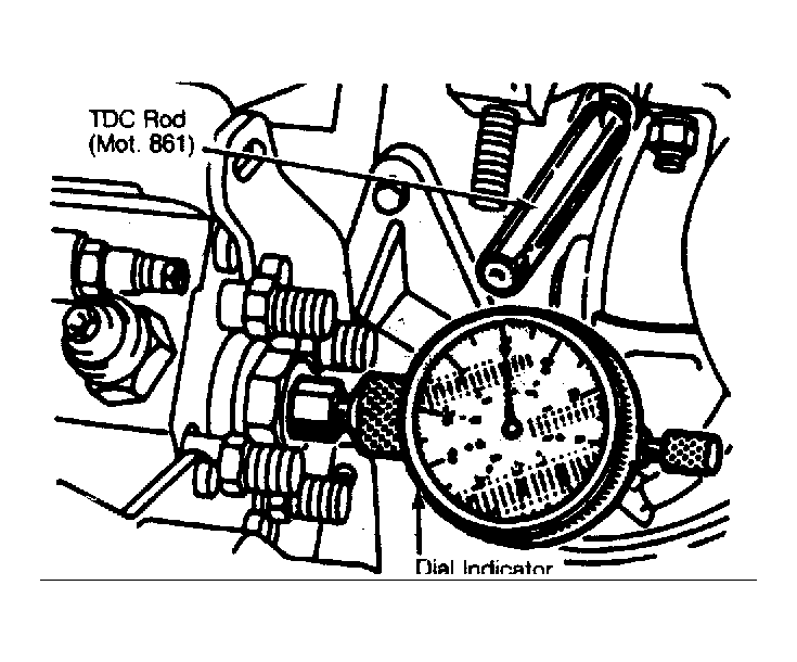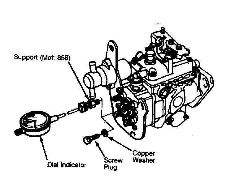 1. Remove screw plug and copper washer from center of 4 high pressure outlets on rear of injection pump. Install Dial Indicator Support (Mot. 856) in place of screw plug. Insert stem of dial indicator into support. See Figure.