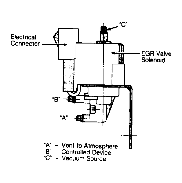 1. Start engine and verify that vacuum is present at vacuum fitting "C" (vacuum source) of EGR valve solenoid. See Fig 1 . Remove vacuum connector from fittings "A" and "B". Connect a vacuum gauge to vacuum fitting "B".