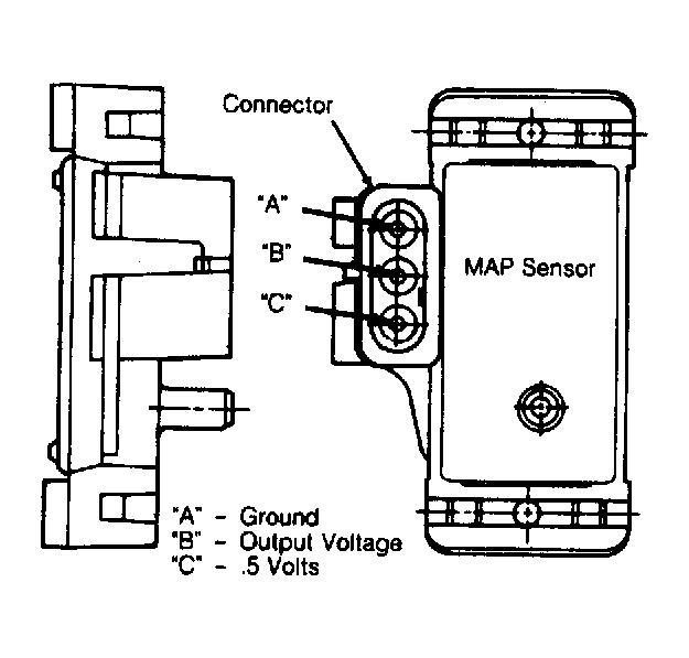 - Inspect MAP sensor hoses and connections. Repair or replace as necessary. With ignition on and engine off, test MAP sensor output voltage at connector terminal "B". (marked on sensor body). See Fig 1
