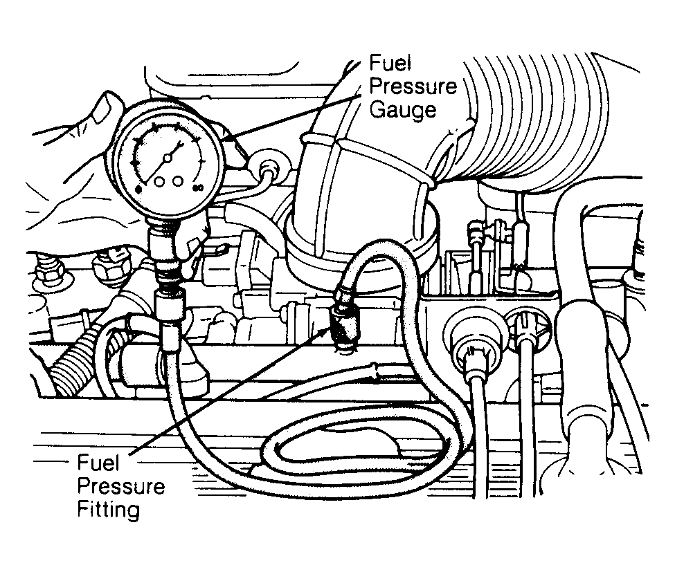 - Remove cap from the pressure test port in fuel rail. See Figure . Connect a 0-60 psi (0-4.22 kg/cm2 ) fuel pressure gauge to pressure fitting on fuel rail. Start and run engine at idle. Note fuel pressure.
