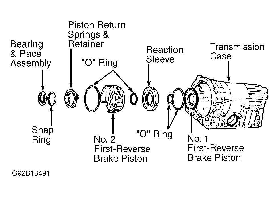 - Remove bearing and race assembly from transmission case. See Fig 1 . Apply low air pressure to transmission case port and check for smooth operation of No. 1 and No. 2 first-reverse brake pistons. See Fig 2 .