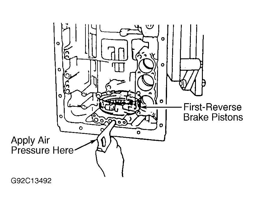 - Apply air pressure to passage in transmission case used to check reverse brake pistons operation and remove No. 2 first-reverse brake piston. See Fig 2 .