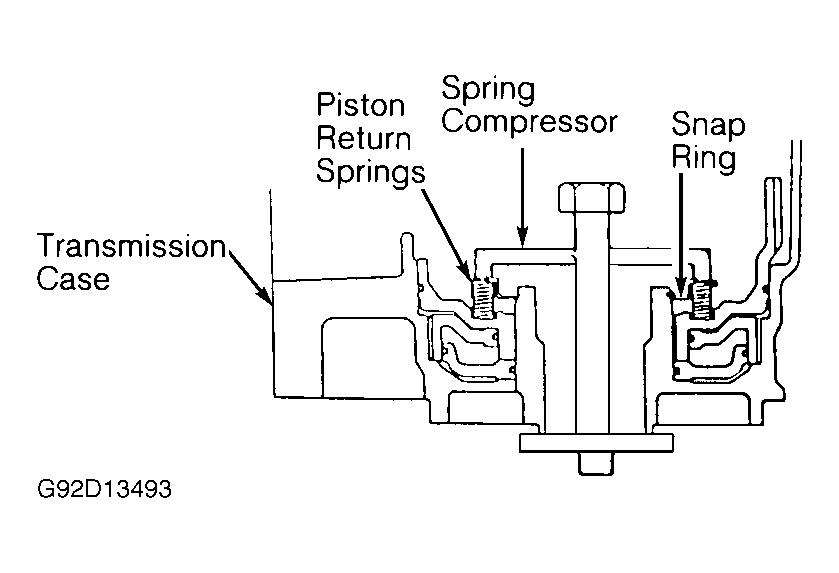 - If pistons DO NOT operate smoothly, transmission or piston may require replacement. Using Spring Compressor (7539), compress piston return springs and remove snap ring. See Fig 3 . Remove spring compressor, piston return springs and retainer.