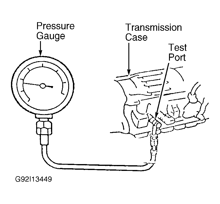 - Ensure fluid level and condition are okay. Install tachometer. Apply parking brake and block the wheels. Using Adapter (7554), connect pressure gauge to test port on side of transmission case. See Fig 1 .