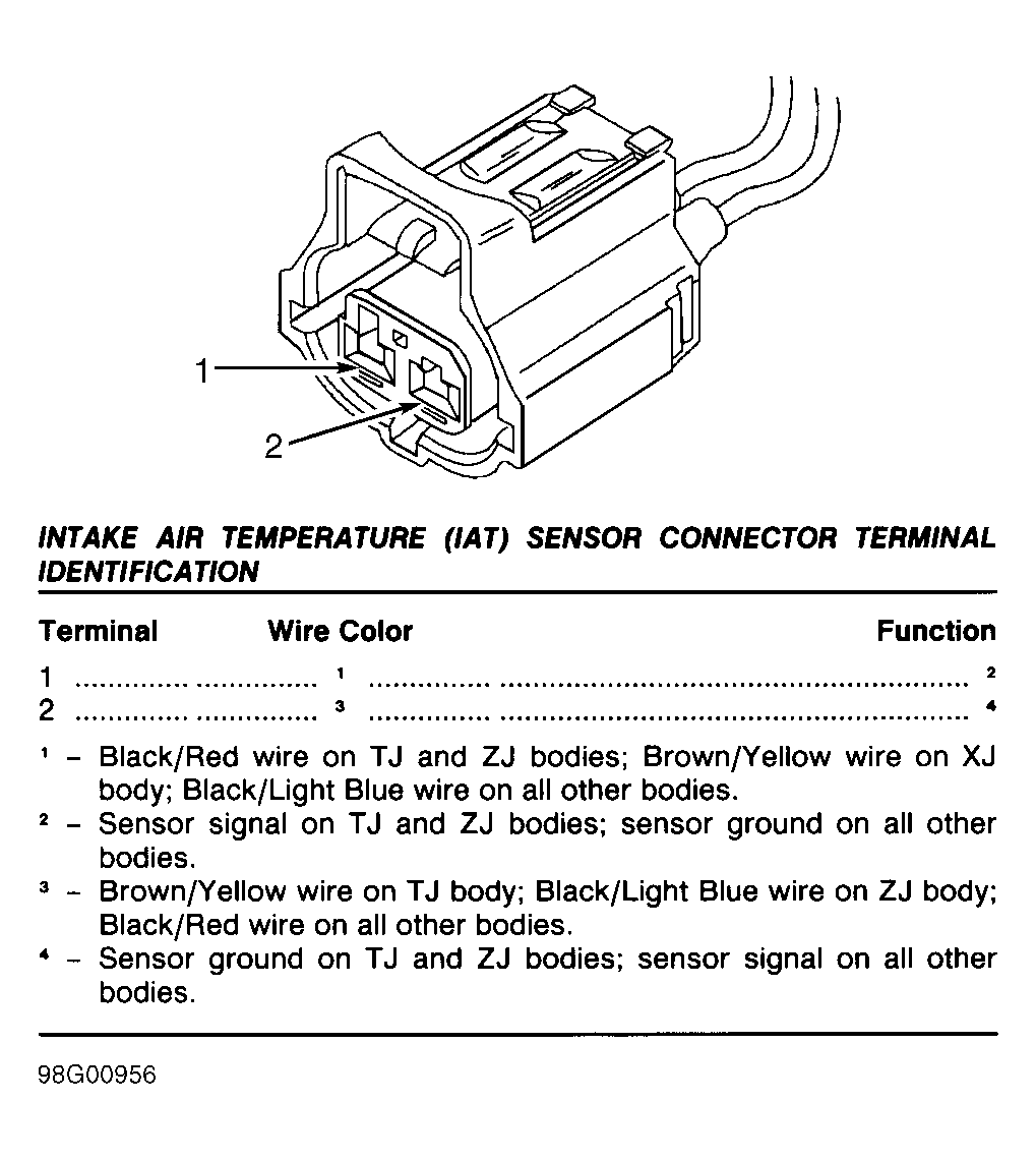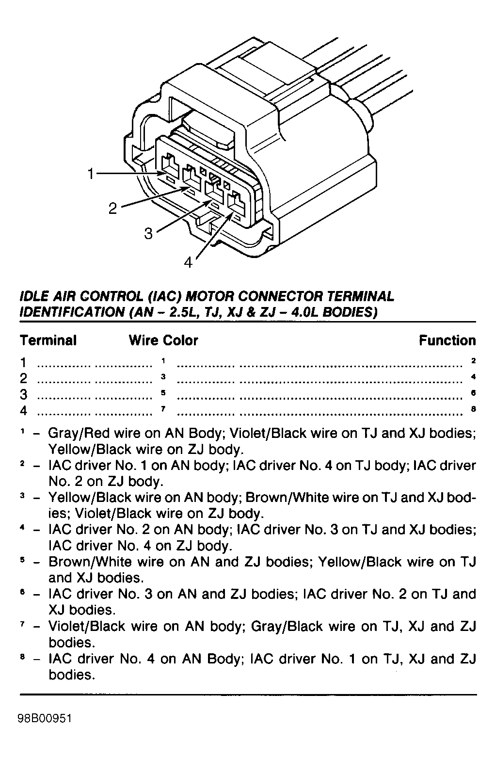 Fig 34: Identifying Idle Air Control (IAC) Motor Connector Terminals (AN - 2.5L, TJ, XJ & ZJ - 4.0L Bodies)