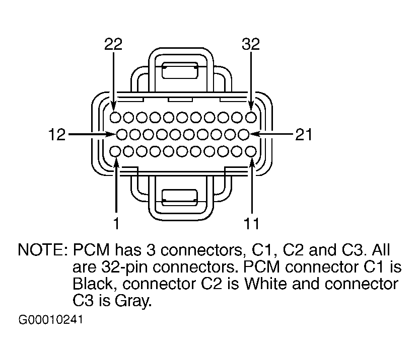 - Turn ignition off. Disconnect PCM Black C1 connector. PCM is located in engine compartment on left front fender, near radiator support. Inspect connector for damaged pins, corrosion and loose terminals. Repair connector as necessary. Using a test light connected to ground, probe terminal No. 22 (Dark Green/Black wire) at PCM C1 connector. See Fig 1