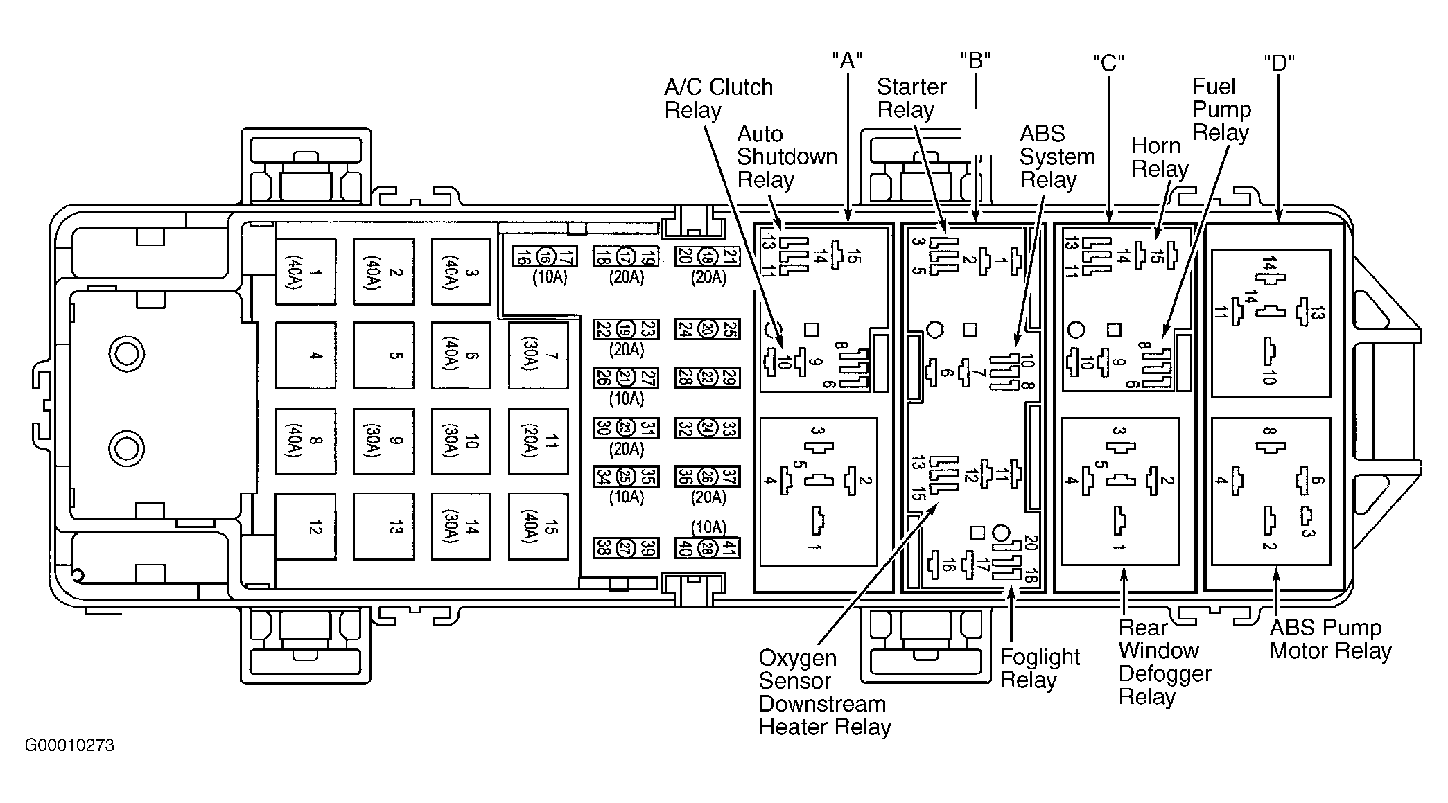 - Turn ignition off. Using a test light connected to ground, probe terminal D10 (Light Green/Red wire) at radiator fan relay socket in Power Distribution Center (PDC). PDC is located in right side of engine compartment, next to battery. See Figure . If test light illuminates brightly, go to next step. If test light does not illuminate brightly, check for open in Light Green/Red wire between radiator fan relay and PDC. Also check fuse No. 5 (40-amp) in PDC. See WIRING DIAGRAMS article. Repair wiring as necessary.