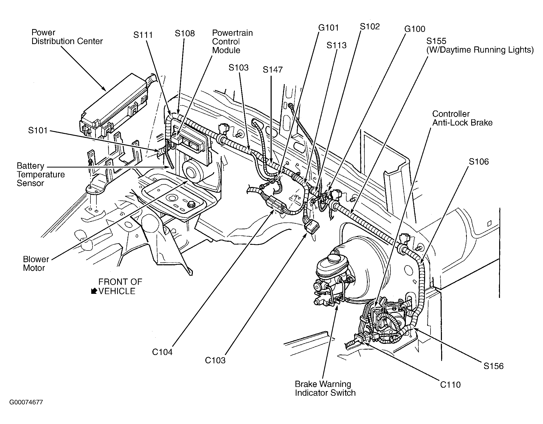 | Powertrain Control Module | In right rear of engine compartment, on firewall. See Figure. |