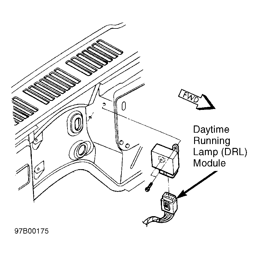 | Daytime Running Lamp (DRL) Module | In rear of engine compartment, on firewall. See Figure. |