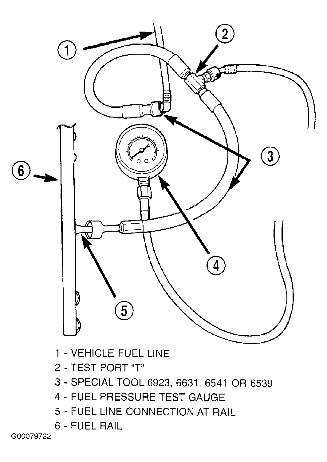 - Turn ignition off. Release fuel pressure. Disconnect fuel supply line from fuel rail. Install Fuel Line Pressure Test Adapter Hose (6539 for 5/16" fuel lines or 6631 for 3/8" fuel lines) between disconnected fuel line and fuel rail. See Fig 1 . Remove fuel fill cap. Insert other end of hose into a graduated container suitable for gasoline. With DRBIII(R), actuate ASD fuel system test for 7 seconds. Do not operate fuel pump longer than 7 seconds. If fuel volume is .5 pt. (.25L) or more, no problem is indicated at this time. Test is complete. If fuel volume is less than .5 pt. (.25L), check for a kinked fuel line between fuel pump module and fuel rail. Repair fuel lines as necessary and retest. If fuel line is okay, replace fuel pump module assembly. See FUEL PUMP MODULE under FUEL SYSTEMS in REMOVAL, OVERHAUL & INSTALLATION article. Perform POWERTRAIN VERIFICATION TEST VER-1 under VERIFICATION TESTS.