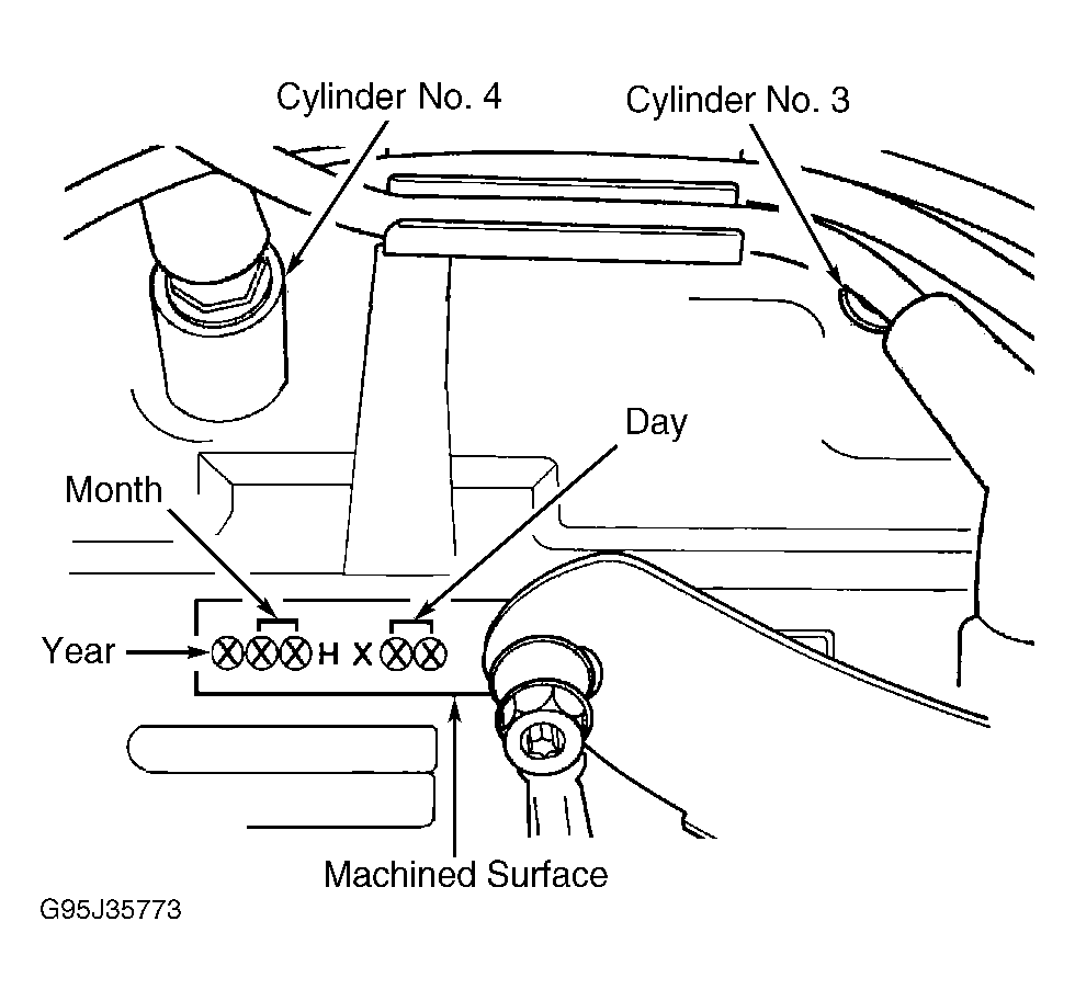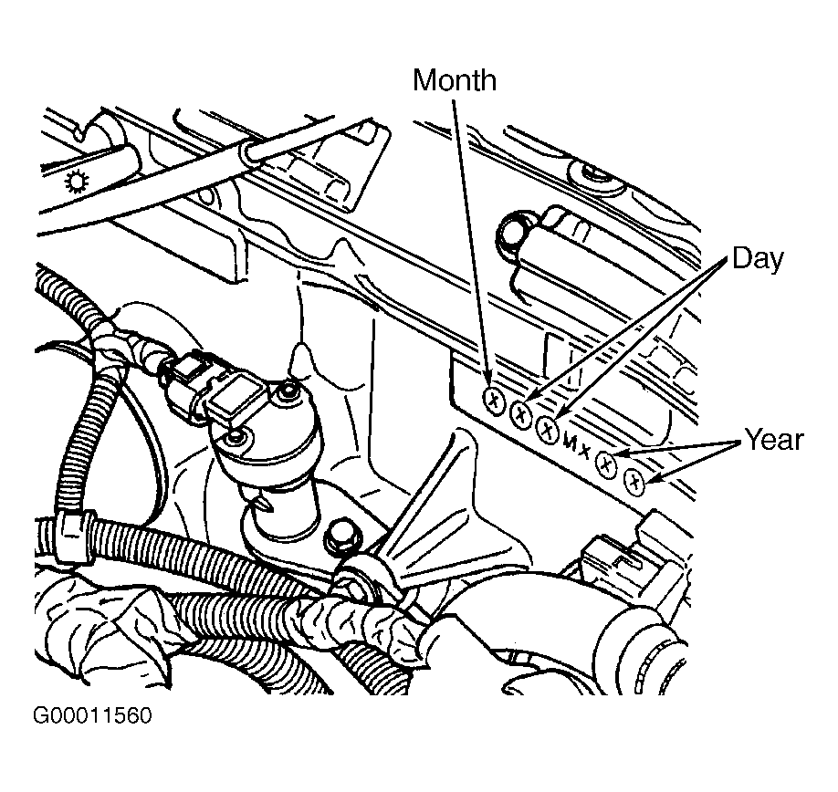 The engine build date code is located on a machined surface on the right side of the cylinder block. SeeFig 1 or Fig 2 . The digits of the code identify the following.