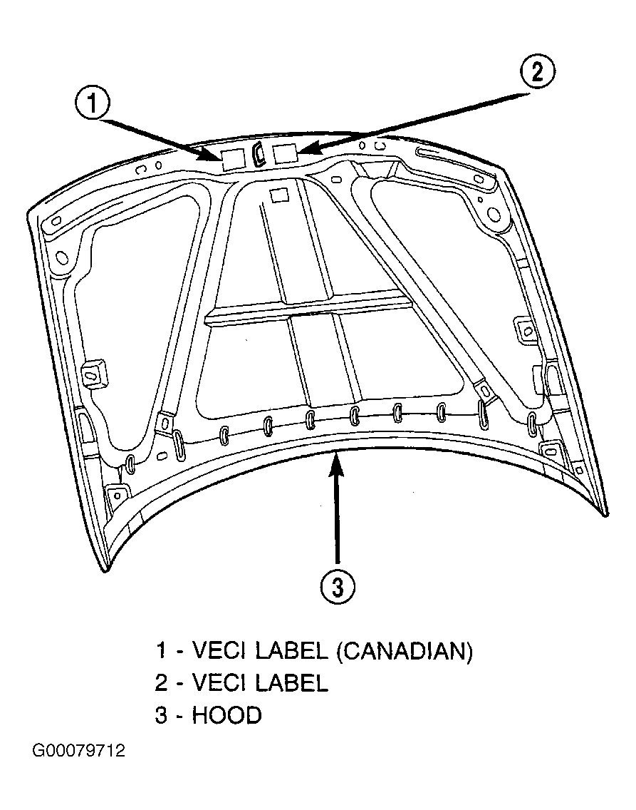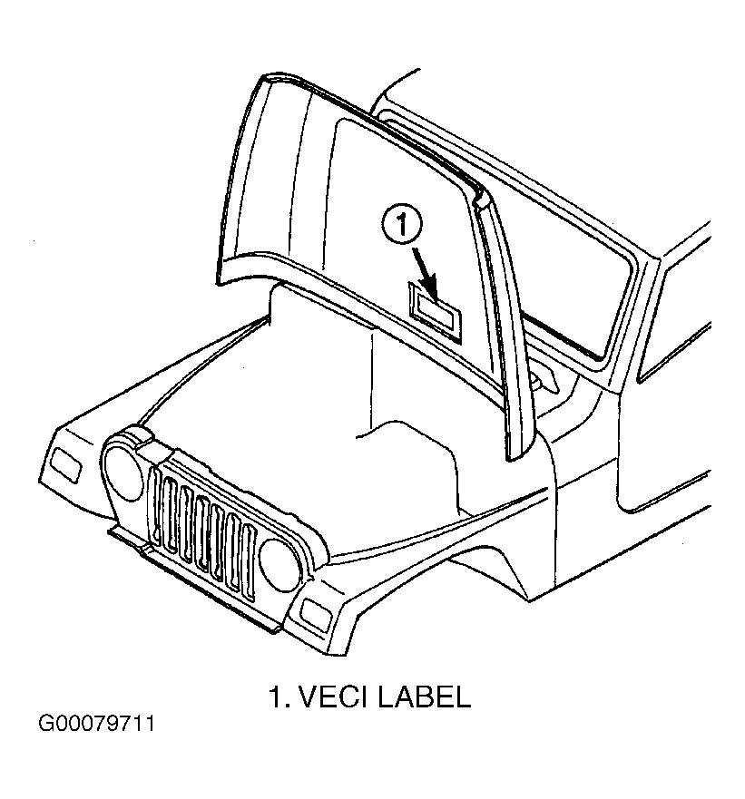 All models have a Vehicle Emission Control Information (VECI) label. On Grand Cherokee and Wrangler, the VECI label is located on underside of hood. See Fig 1 or Fig 3 . On Liberty, the VECI label is located in the engine compartment. See Fig 2 . On all models, the label cannot be removed without defacing label information and destroying the label. The label contains the vehicle's emission specifications and vacuum hose routings. All hoses must be connected and routed according to the label. There are unique labels for vehicles built for sale in the state of California and the country of Canada. Canadian labels are written in both the English and French languages. The VECI label contains the following: