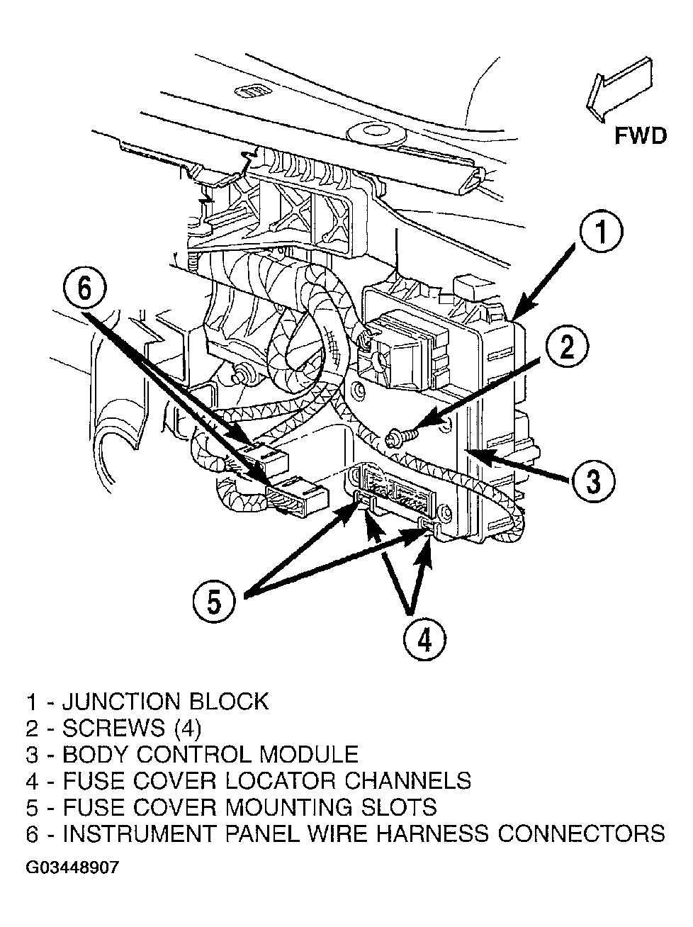 - While applying a slight upward pressure to the instrument panel fuse cover over the front latches, slowly slide the front latches through the locator channels toward the front of the vehicle until the latches exit the front of the locator channels. This will locate the front latches at the mounting slots in the lower housing of the body control module.