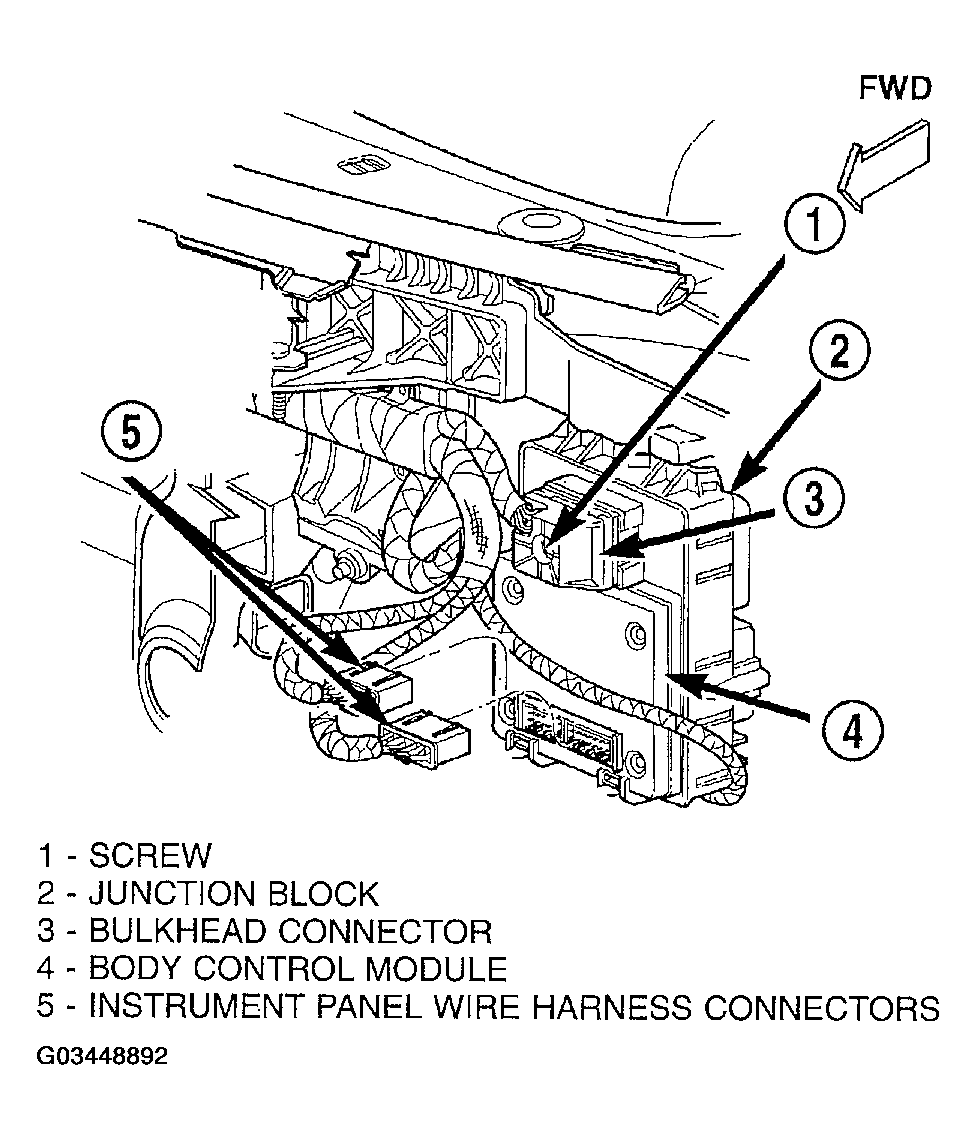 - Reach behind the JB to disconnect the two instrument panel wire harness connectors from the Body Control Module (BCM) connector receptacles located near the bottom of the JB (Fig 1 ).