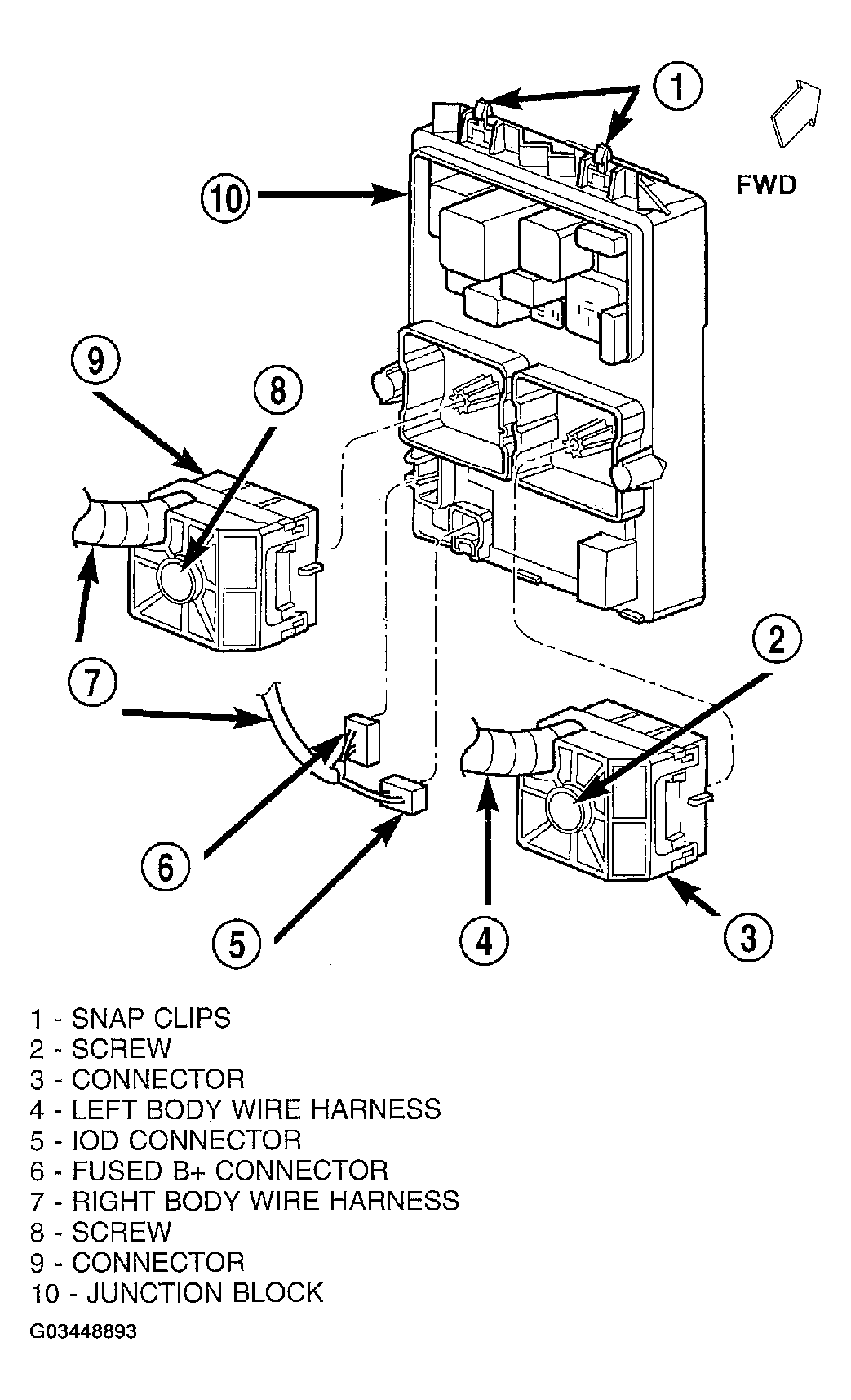 - Disconnect the fused B(+) and the IOD wire harness connectors from the connector receptacles located near the bottom of the JB (Fig 2 ).