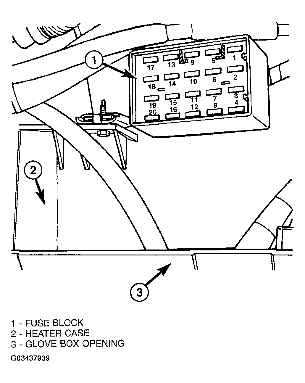 The molded plastic fuseblock module housing has an integral mounting bracket that is secured with two screws to a bracket welded on the dash panel just above the heater and air conditioner housing. The glove box is rolled down from the instrument panel for service access of the fuseblock module fuses. An adhesive-backed fuse layout map (Fig 2) to ensure proper fuse identification.