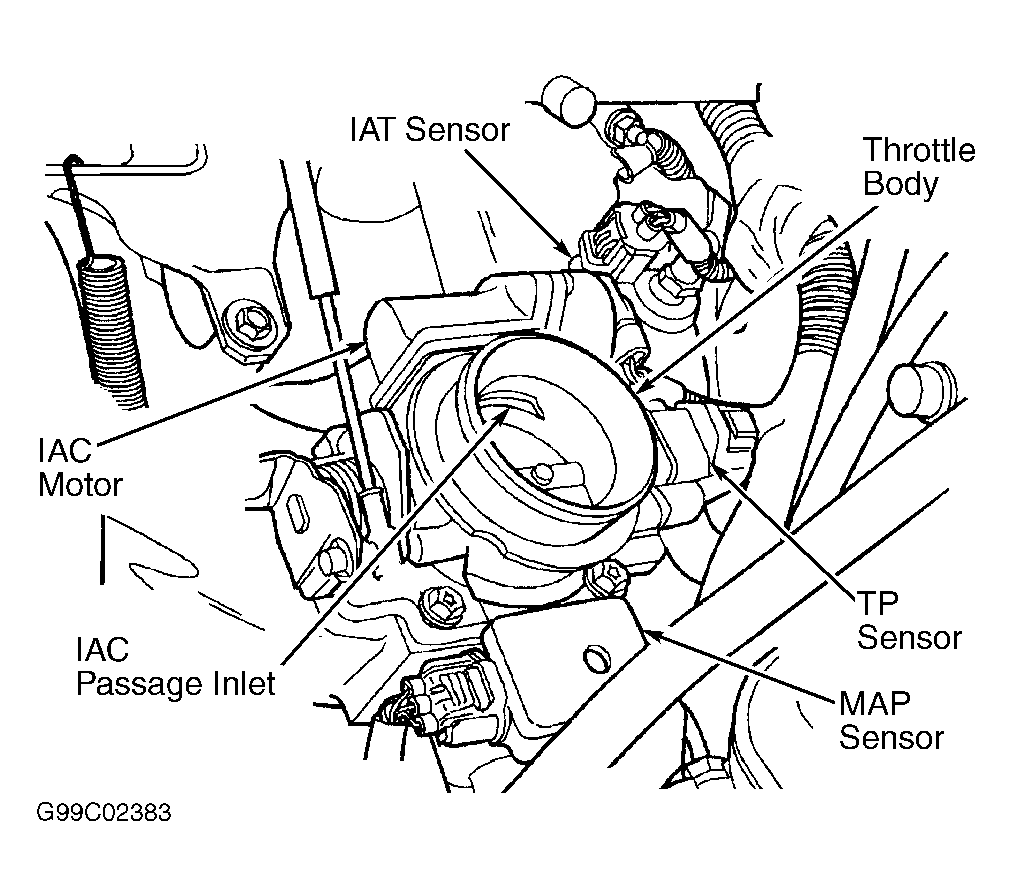 Fig 3: Locating IAT, MAP, & TP Sensors, & IAC Motor (2.4L)