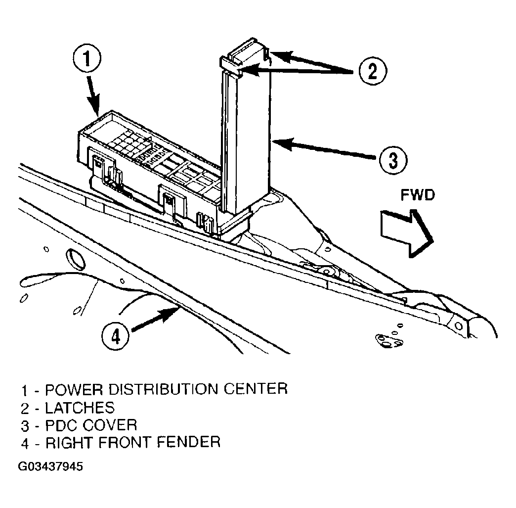 The PDC housing is secured in the engine compartment at four points. Integral mounts on both sides of the PDC housing engage and latch to stanchions that are integral to the stamped steel PDC bracket. The PDC bracket is secured to the top of the right front inner fender shield with three screws, two at the front of the bracket and one at the rear. The PDC is integral to the dash wire harness, which exits from the bottom of the PDC housing. The PDC housing has a molded plastic cover that includes two integral latches at the rear and pivot hooks at the front that snap over a hinge pin on the front of the PDC housing. The PDC cover is easily opened or removed for service access and has a convenient fuse and relay layout map integral to the inside surface of the cover to ensure proper component identification.