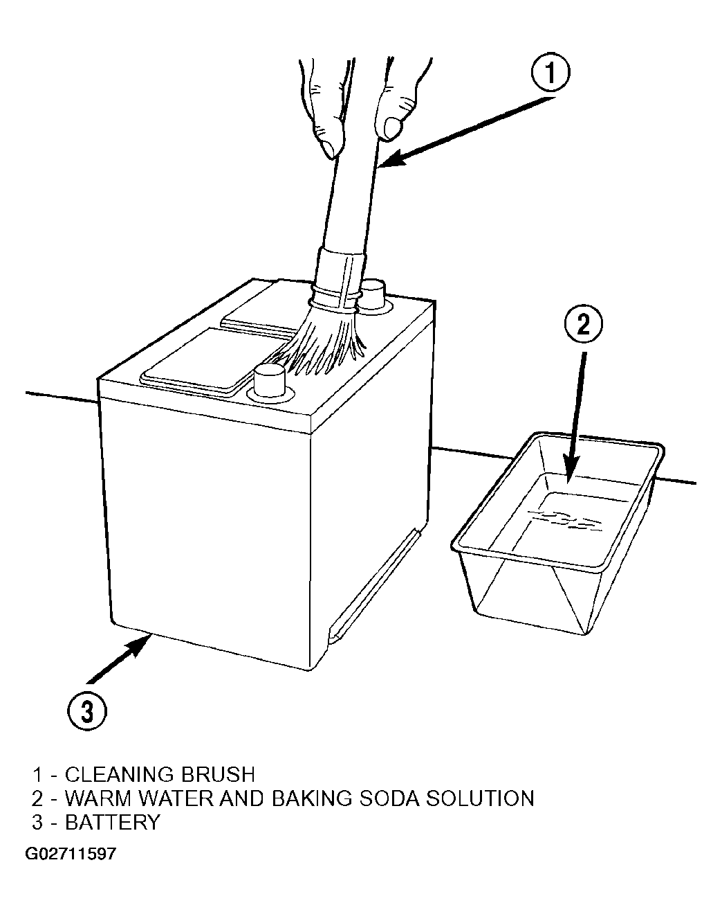 - If the removed battery is to be reinstalled, clean the outside of the battery case and the top cover with a sodium bicarbonate (baking soda) and warm water cleaning solution using a stiff bristle parts cleaning brush to remove any acid film (Fig 2 ). Rinse the battery with clean water. Ensure that the cleaning solution does not enter the battery cells through the vent holes. If the battery is being replaced, refer to SPECIFICATIONS for the factory-installed battery specifications. Confirm that the replacement battery is the correct size and has the correct ratings for the vehicle.