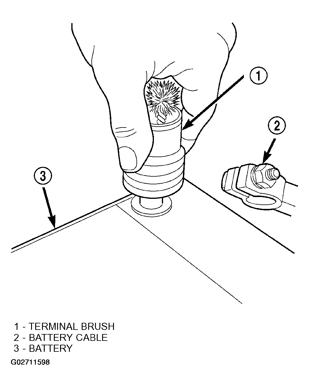 - Clean any corrosion from the battery terminal posts with a wire brush or a post and terminal cleaner, and a sodium bicarbonate (baking soda) and warm water cleaning solution (Fig 3 ).