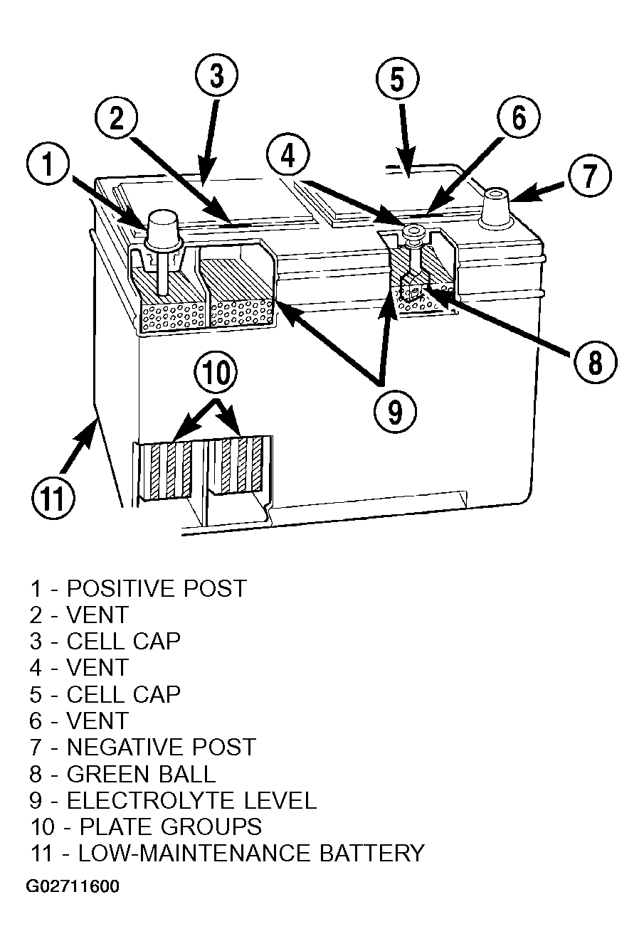 The factory-installed battery has a built-in test indicator (hydrometer). The color visible in the sight glass of the indicator will reveal the battery condition. Refer to STANDARD PROCEDURE for the proper built-in indicator test procedures. The factory-installed low-maintenance battery has removable battery cell caps. Water can be added to this battery. The battery is not sealed and has vent holes in the cell caps. The chemical composition of the metal coated plates within the low-maintenance battery reduces battery gassing and water loss, at normal charge and discharge rates. Therefore, the battery should not require additional water in normal service. If the electrolyte level in this battery does become low, water must be added. However, rapid loss of electrolyte can be caused by an overcharging condition. Be certain to diagnose the charging system after replenishing the water in the battery for a low electrolyte condition and before returning the vehicle to service (Refer to GENERATORS & REGULATORS ).