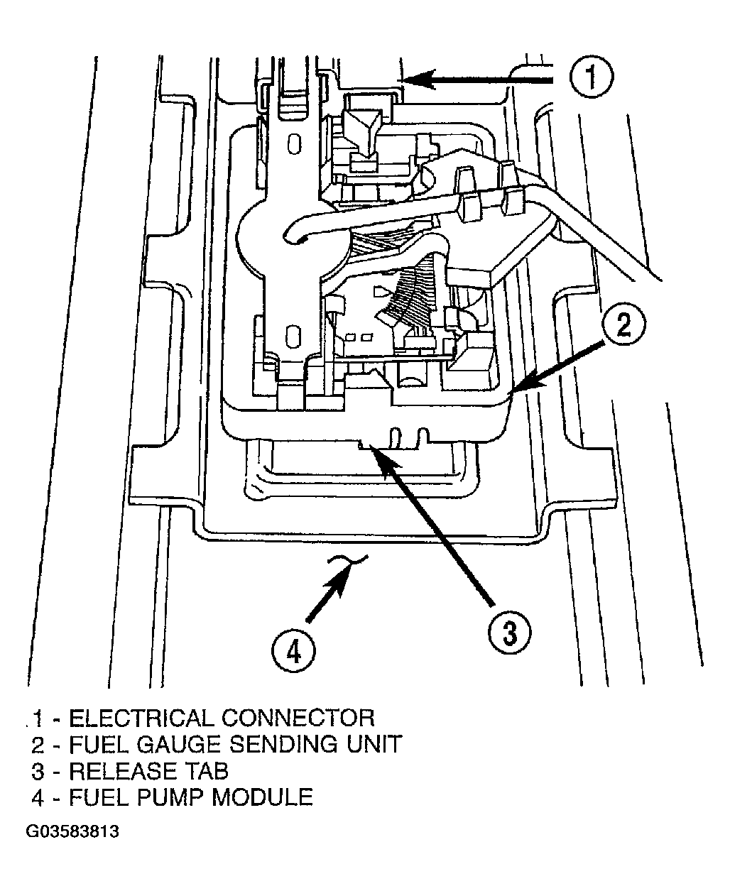 The fuel gauge sending unit (fuel level sensor) and float assembly is located on the side of fuel pump module (Fig 1 ). The fuel pump module is located within the fuel tank.